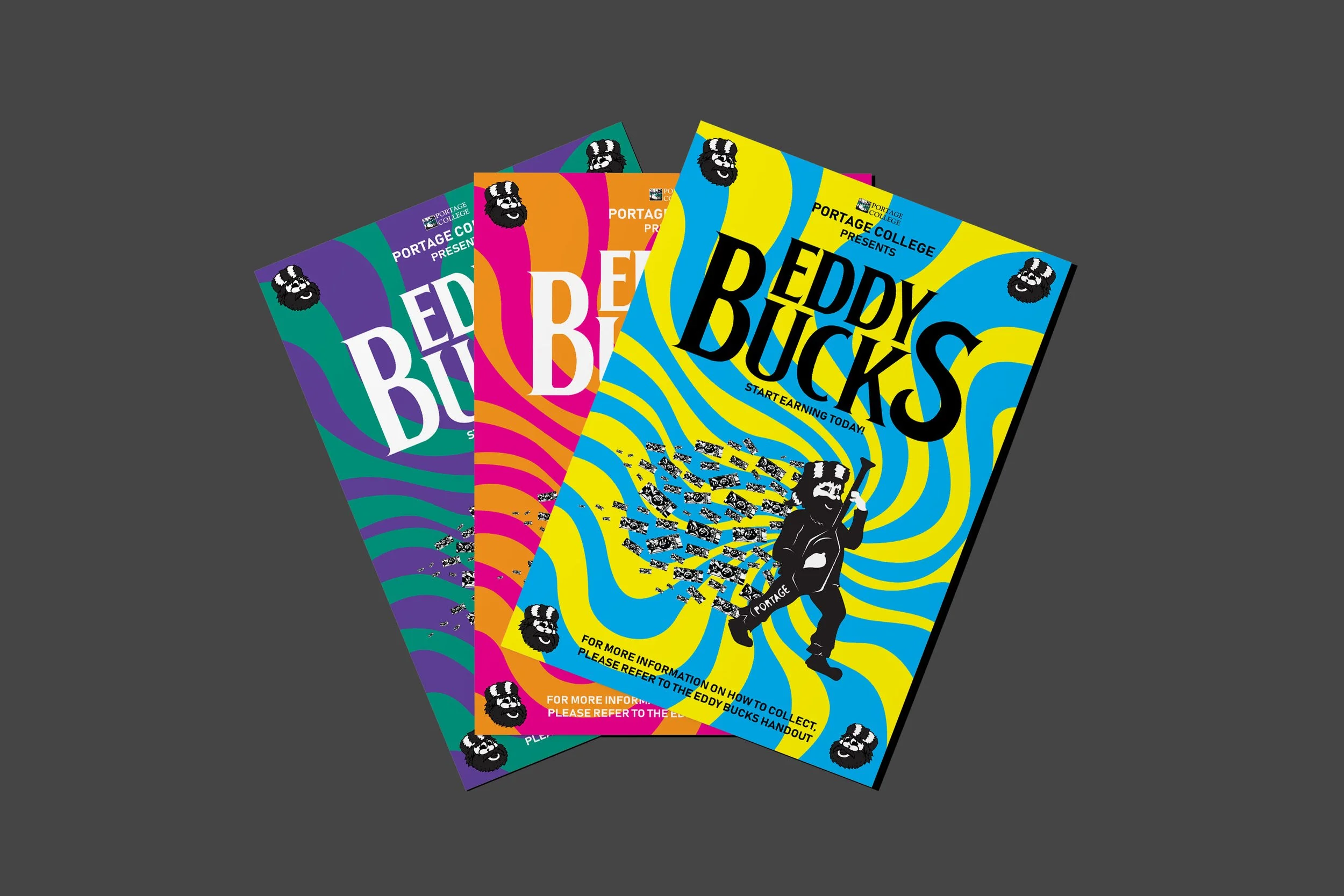 Eddy Bucks are a form of currency used at Portage College. By participating in activities to boost college spirit, students have the chance to Earn Eddy bucks, which can be redeemed for gift cards or used to purchase items from the College’s bookstore and cafeteria. The campaign was introduced to help boost student engagement and encourage students to participate in college events.
