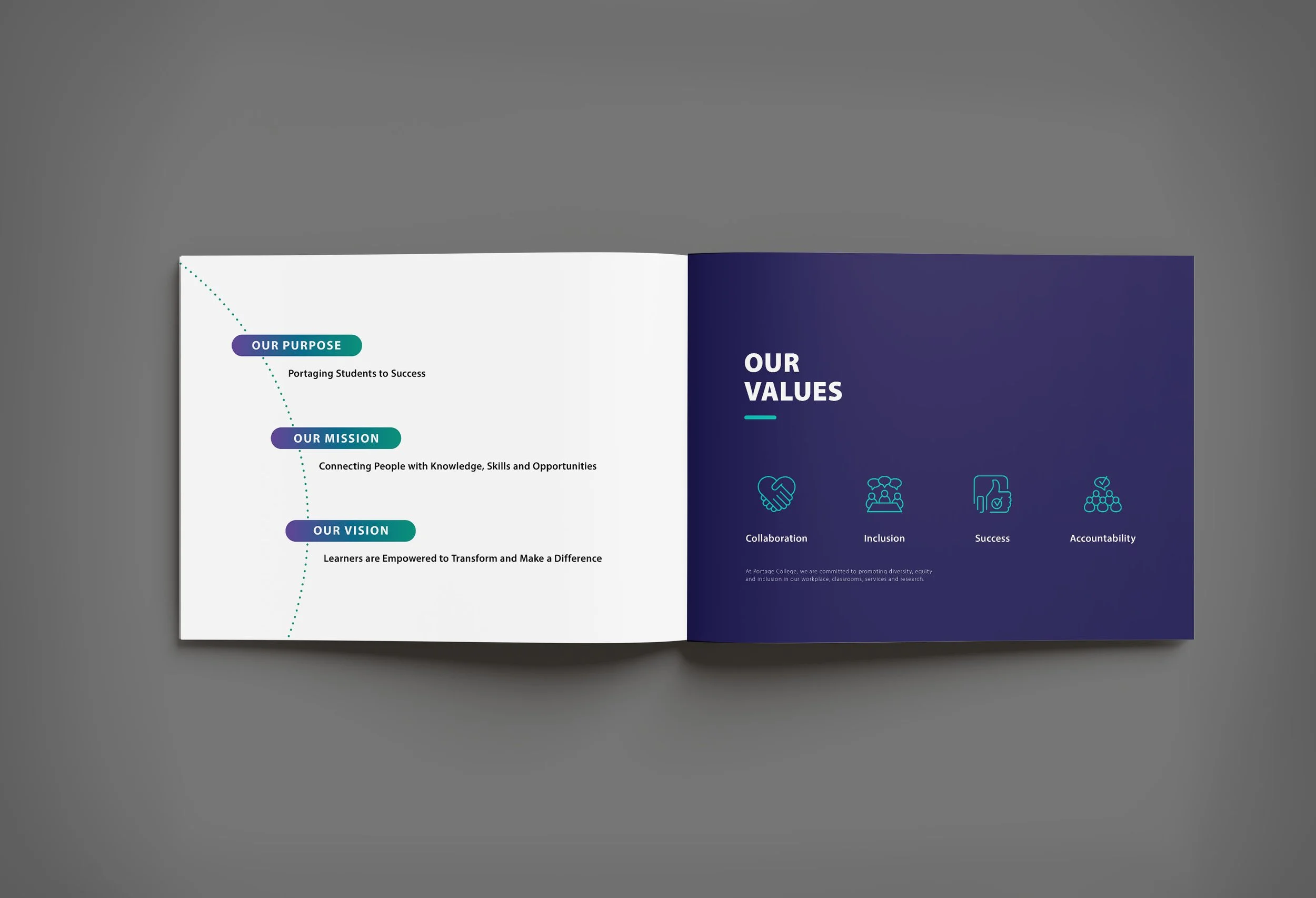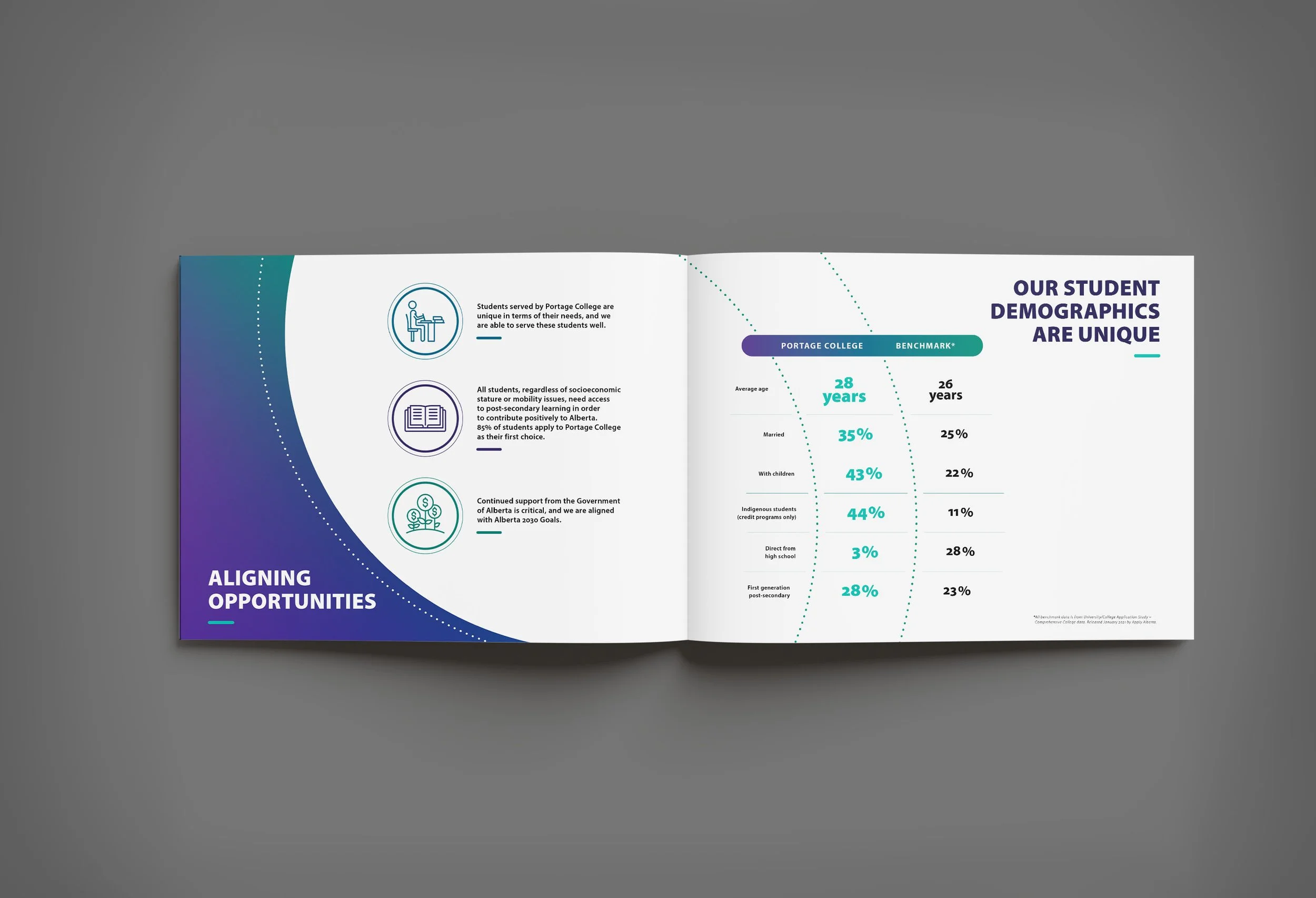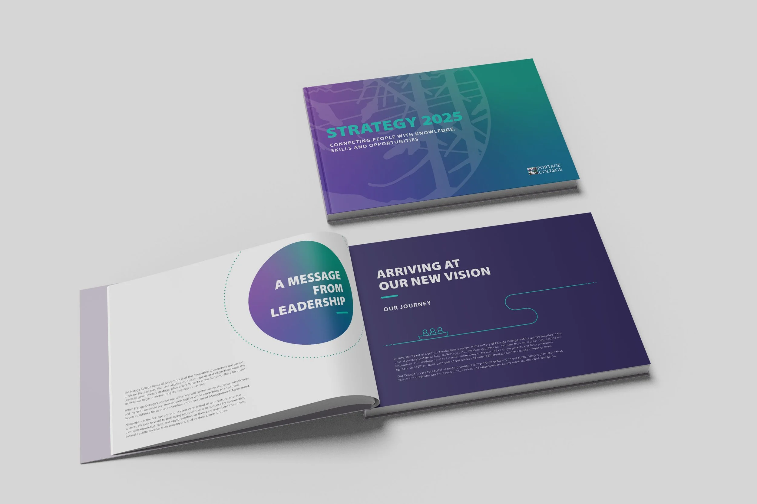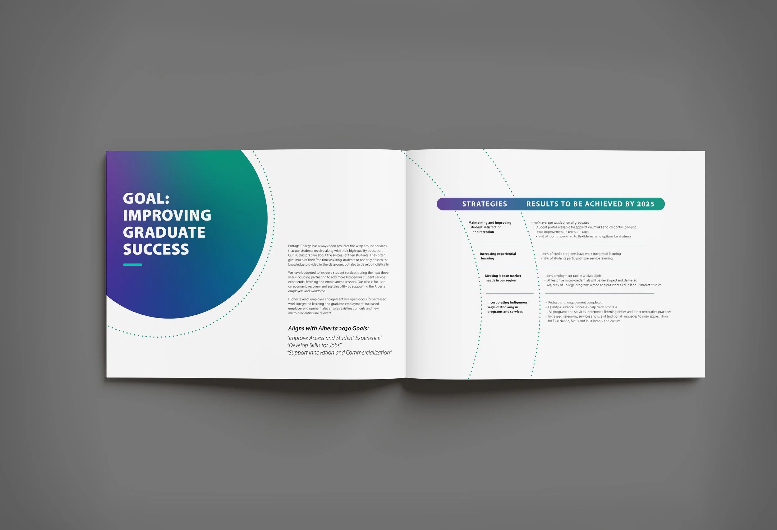 This project includes a booklet and accompanying brochure for Portage College’s Strategy 2025, an initiative to align the College’s vision, goals and objectives with the provincial government’s strategic plan titled “Alberta 2030: Building Skills for Jobs”.